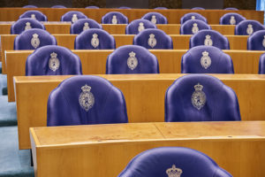 Empty seats with the coat of arms of the Tweede Kamer (Second Chamber).